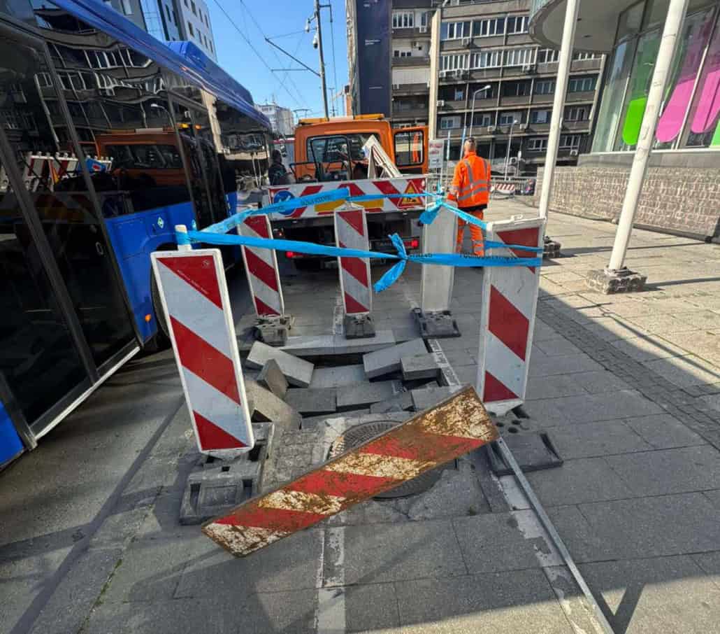 Због дефекта на канализационој мрежи у Рузвелтовој улици, код Тржног центра „Зира“, дошло је до урушавања коловозне конструкције у близини трамвајских шина и тиме до угрожавања учесника у саобраћају. С обзиром на то да је неопходно што пре оспособити функционисање канализационе мреже и спречити даље урушавање коловоза, данас у уторак, 17.03.2026. године започети су радови на санацији.